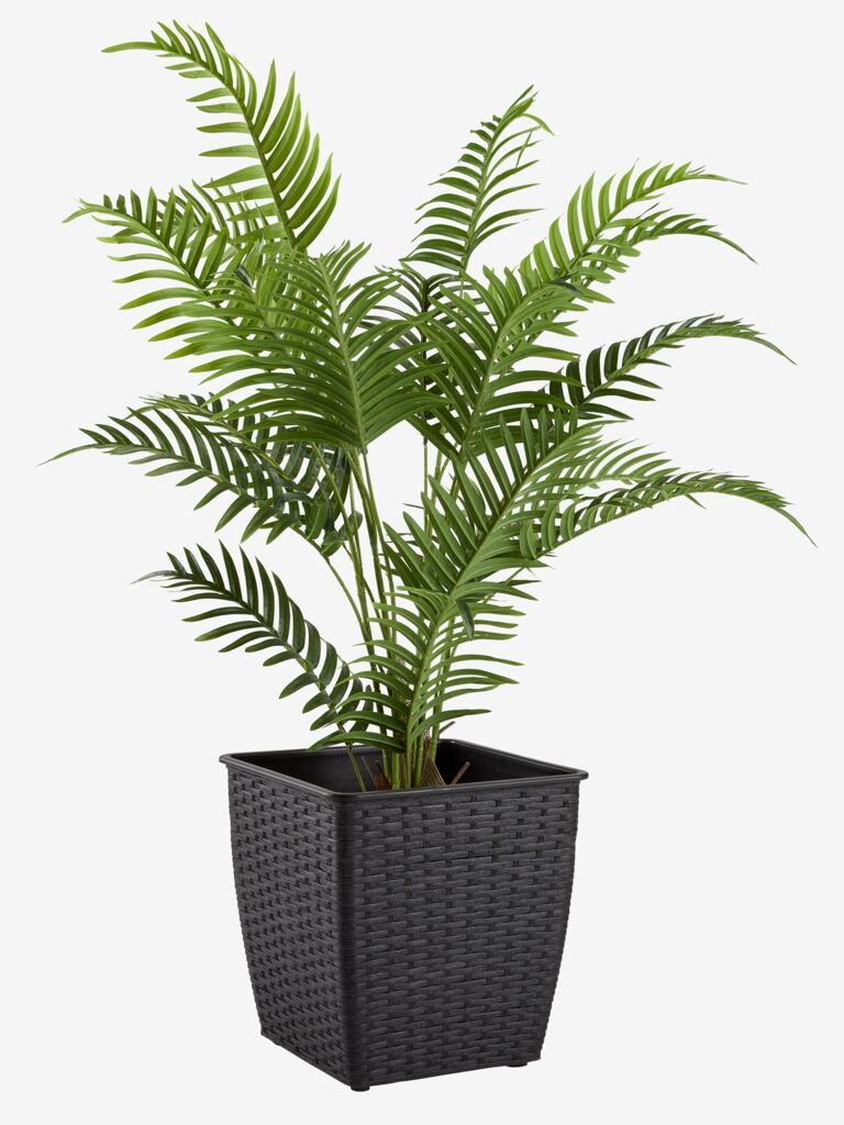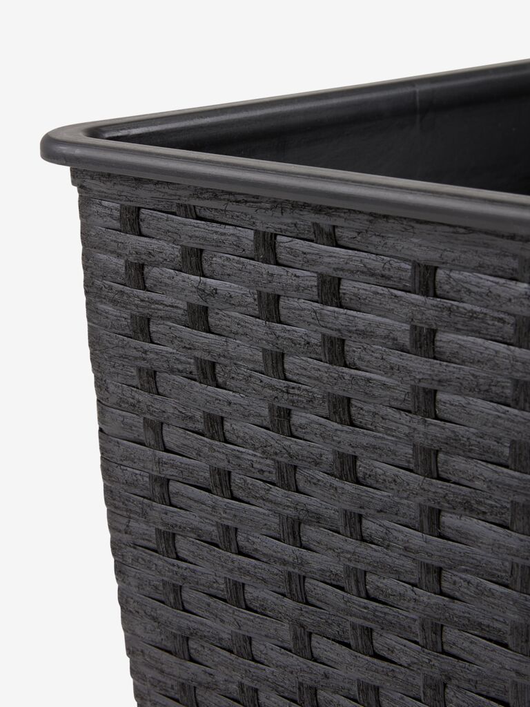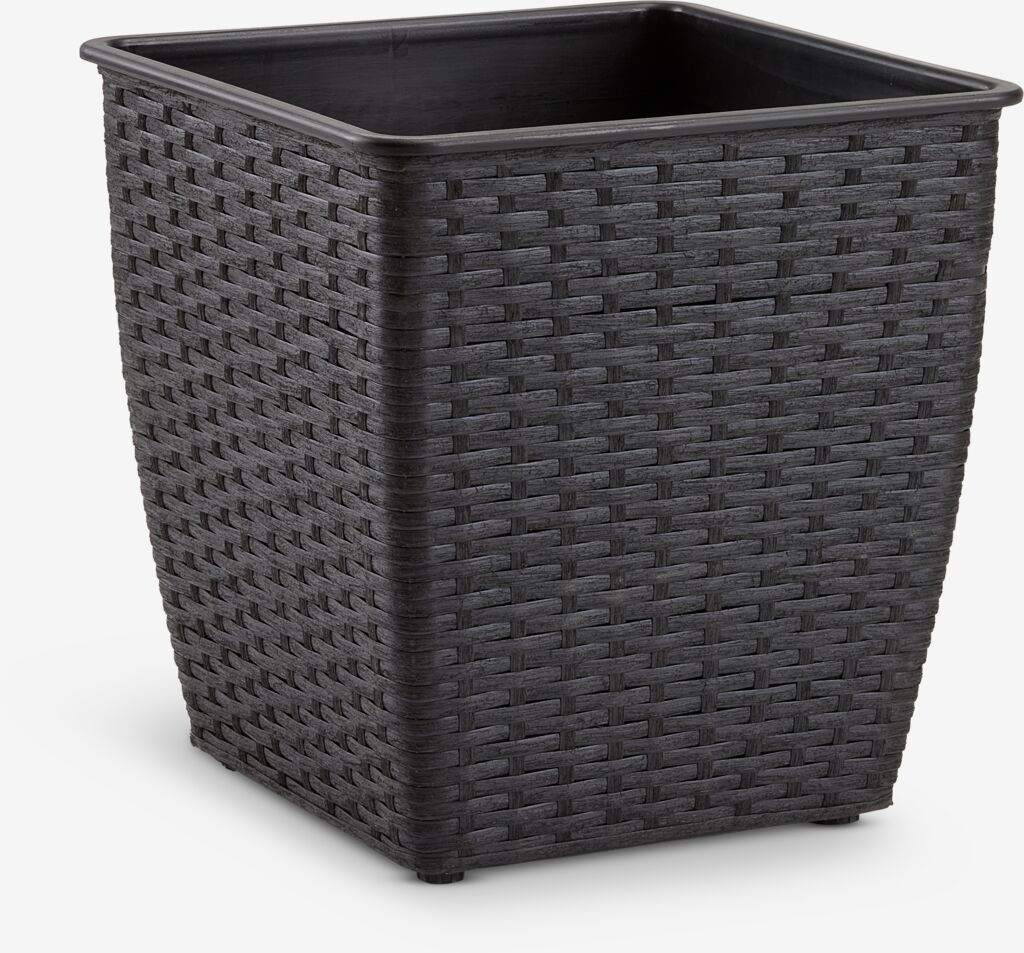 Pletena saksija pletenog dizajna od izdržljivog, crnog poliratana. Materijal je lagan i otporan na smrzavanje, što saksiju čini pogodnom za vanjsku upotrebu. Otvor za dreniranje vode može se lako napraviti. Š31 x D31 x V32 cm