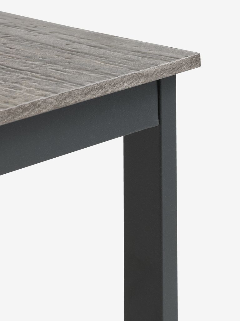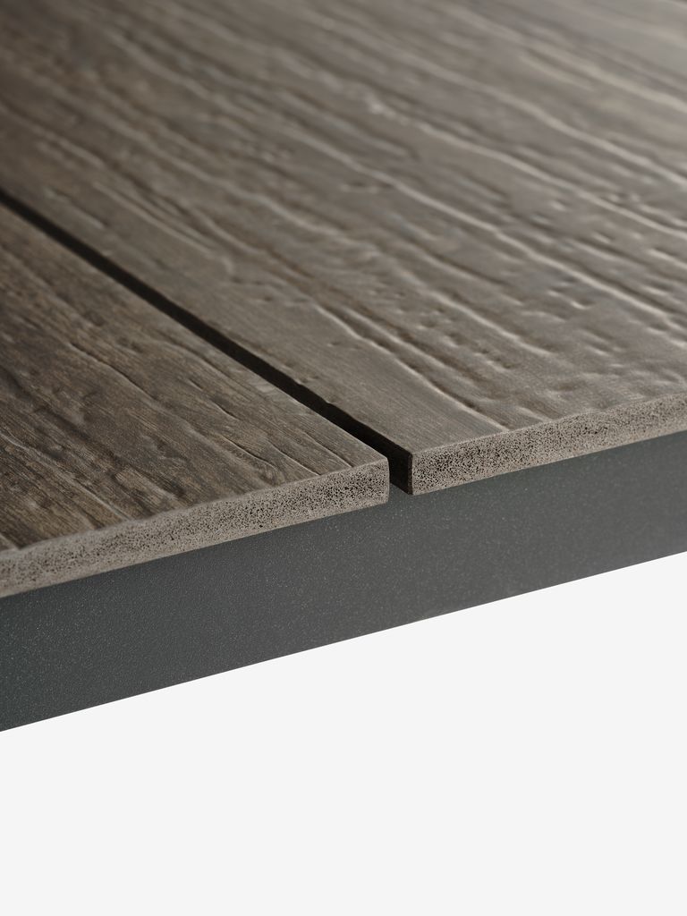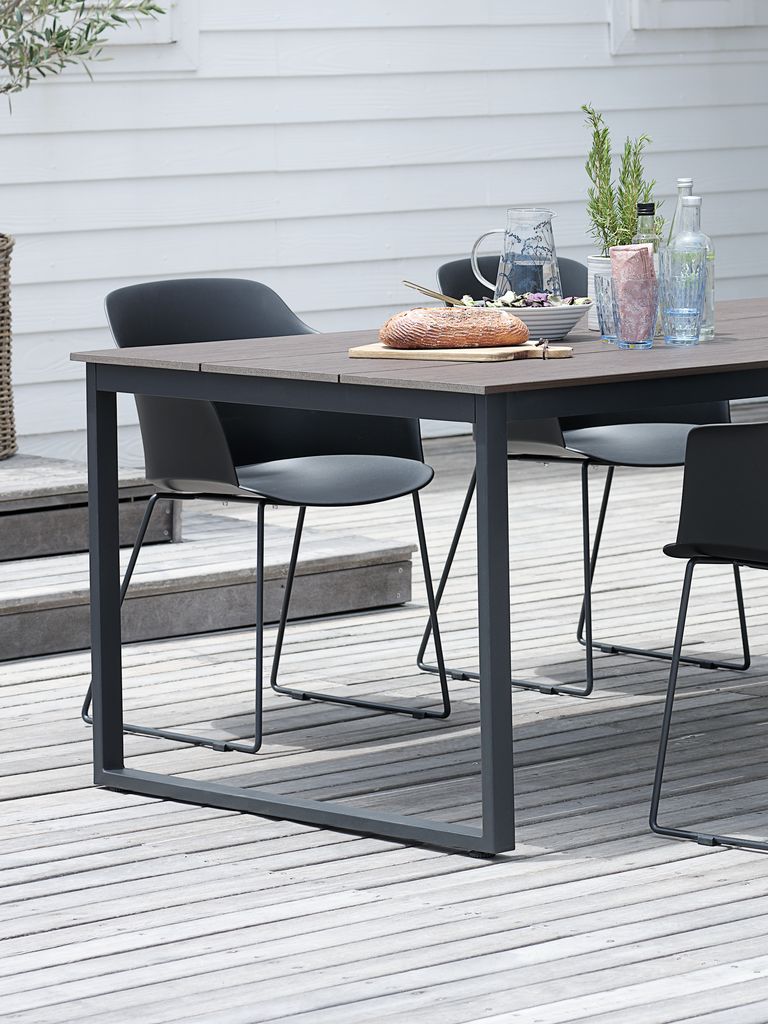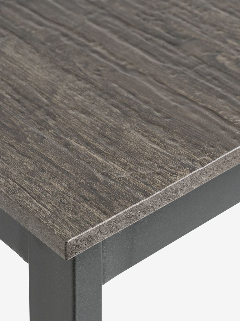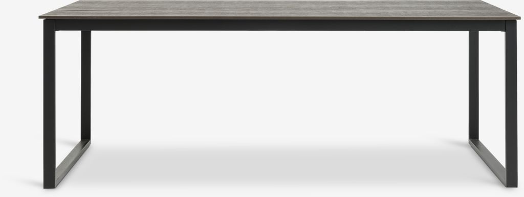 Baštenski stol sa tamno smeđom površinom od umjetnog drveta. Crni okvir od aluminija i noge od čelika obloženog prahom. Umjetno drvo ima izgled i teksturu prirodnog drveta bez potrebe za održavanjem. Aluminij je lagan i robustan materijal koji ne rđa. Š100xD210xV74 cmAluminij, čelik i umjetno drvo. Š100xD210xV74 cm