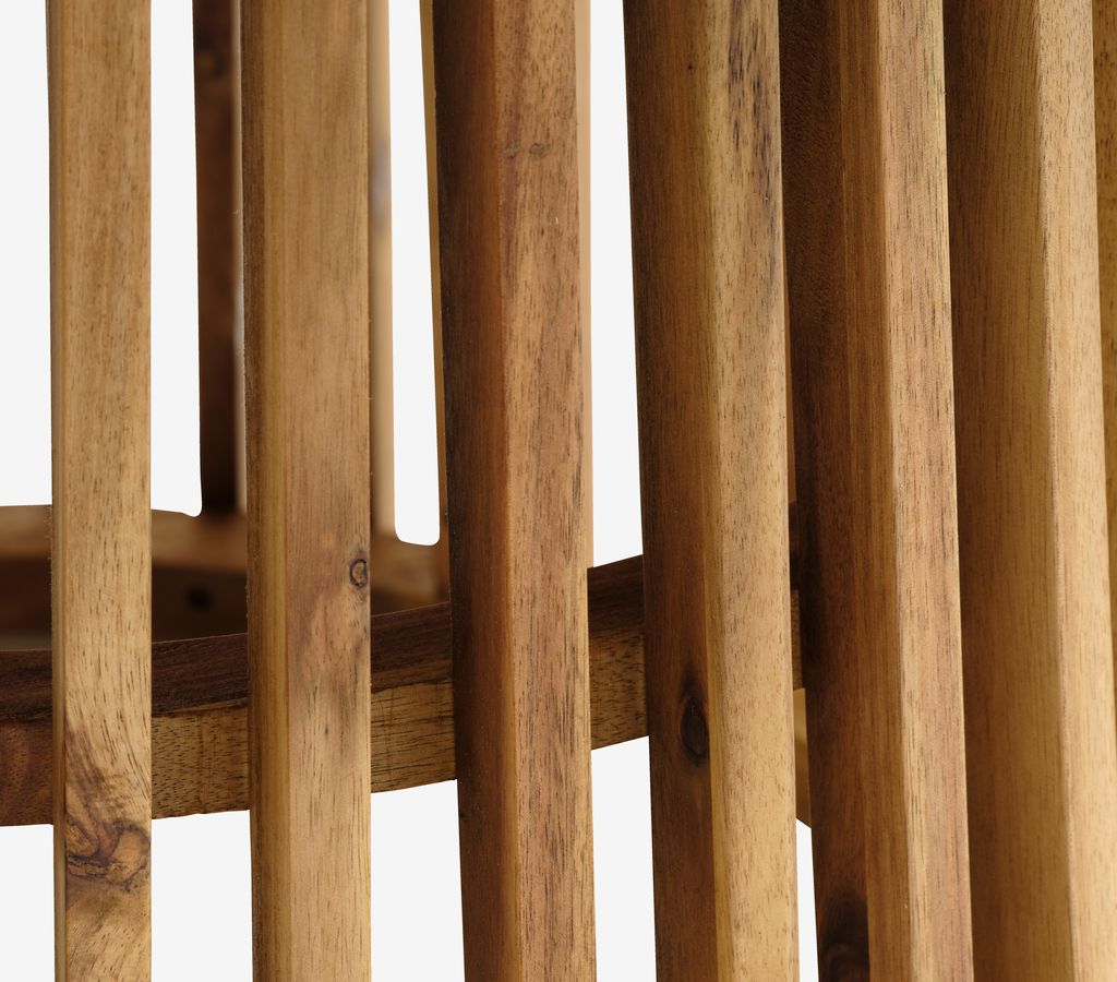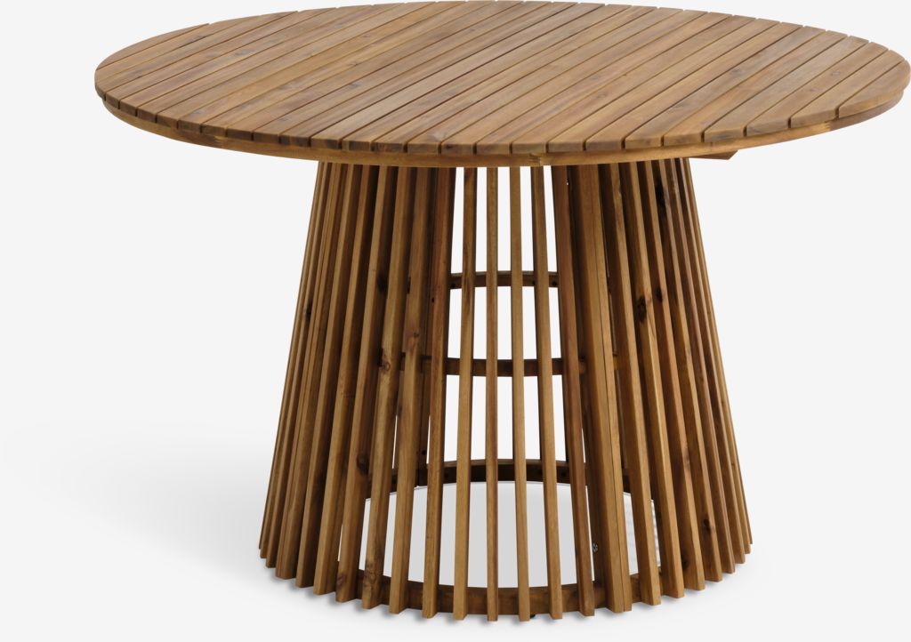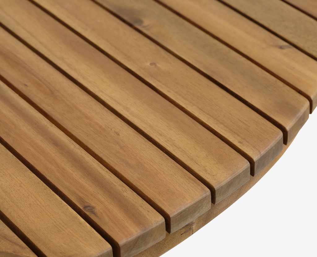 Baštenska garnitura za 4 osobe. Stol: nauljeno FSC™ tvrdo drvo. Ø120xV74 cm. Stolice: aluminij i plastika sa UV-zaštitom. Mogu se složiti jedna na drugu.