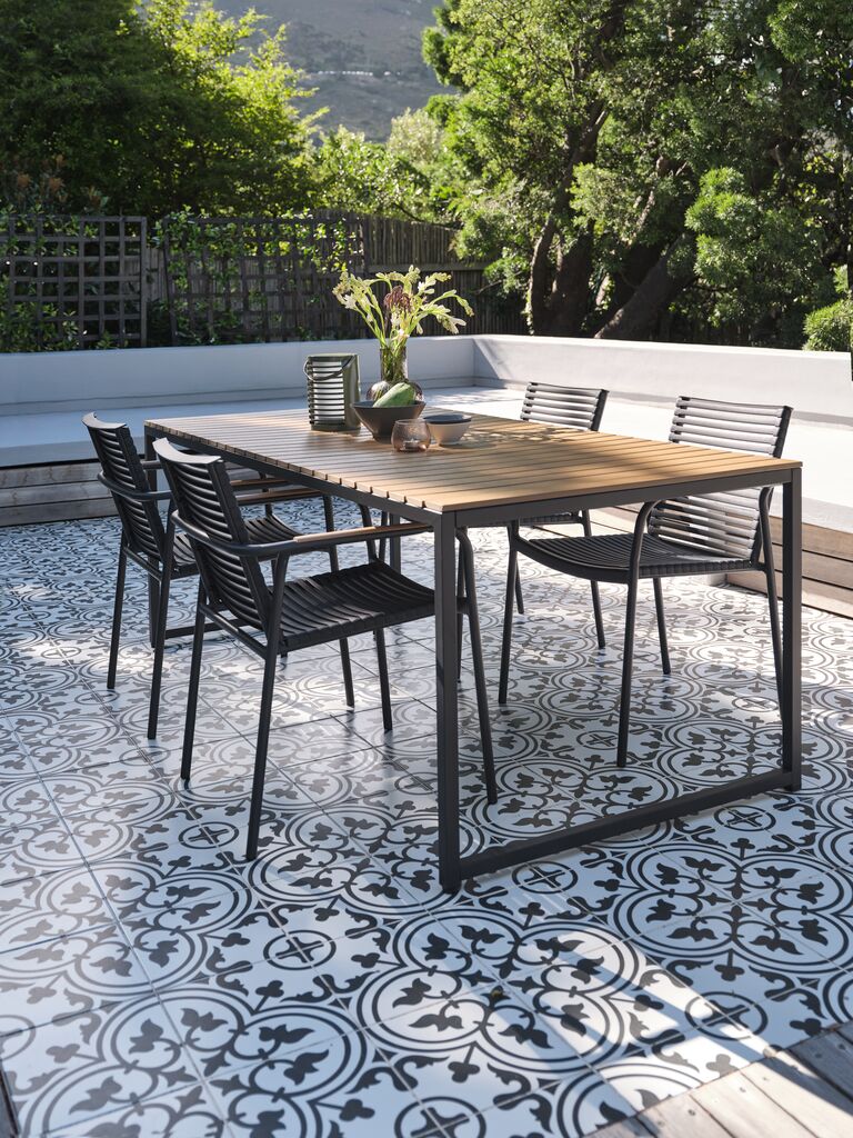 | Materijal | Ram/konstrukcija: Aluminij je lagan i elegantan materijal koji ne hrđa. Nije ga potrebno održavati i lako se čisti vlažnom krpom. Umjetno drvo je sintetički materijal koji ne zahtijeva održavanje i ima prirodnu strukturu drveta. Napravljen je od plastike, kao što je polistiren, koja je izdržljiva i otporna na vremenske uslove. Umjetno drvo je UV-zaštićeno što štiti površinu boje. |