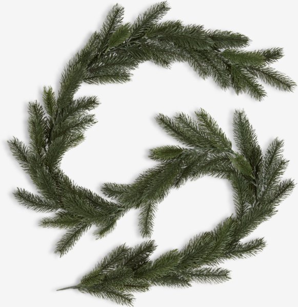 Tamnozeleni vijenac s klasičnim, jednostavnim izgledom. Vijenac je savitljiv i može se lako oblikovati i okačiti duž ograde ili iznad vrata. D180 cm